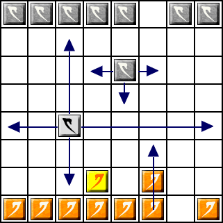 Déplacement: Les Larrons se déplacent d'une case orthogonale vers l'avant ou sur les côtés, ils ne peuvent reculer. Le Dux se déplace orthogonalement d'un nombre de case indéterminé dans toutes les directions (comme la tour aux échecs) Tous les pions peuvent se déplacer en effectuant un saut court par dessus une pièce amie, cela dans toutes les directions (y compris en arrière) |